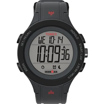 Matte gray 42mm resin case with red accents, completed with a matte gray silicone strap and buckle clasp Digital dial with sports-stopwatch 200 lap memory, chronograph watch and interval training timer INDIGLO Light Up Watch Digital Dial Water resistant to 100m (330ft: in general, suitable for swimming, snorkeling, scuba diving and other activities that involve water) This watch was dreamed up and created by athletes, with your running goals in mind. Many functionalities have been packed into a sleek design, with tools to track laps and intervals. For tempo runs, intervals and speed-drill sessions, the watch can signal warm-ups and cool-down segments along with regular interval readouts.