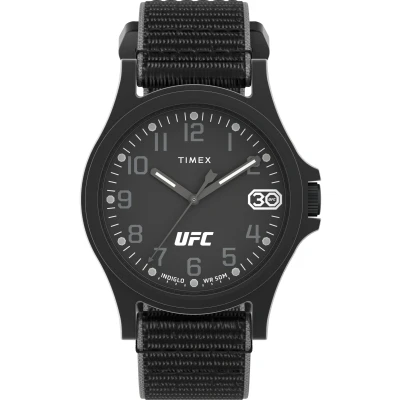 This Timex Ufc Apex Analogue Watch for Men is the perfect timepiece to wear or to gift. It's Black 40 mm Round case combined with the comfortable Black Fabric watch band will ensure you enjoy this stunning timepiece without any compromise. Operated by a high quality Quartz movement and water resistant to 5 bars, your watch will keep ticking. The UFC Apex 30th is a standout style that commemorates the 30th anniversary of UFC with its high-contrast black INDIGLO® backlit dial. This Analogue watch has a function: Luminous Hands and Indiglo Light High quality 21 cm length and 20 mm width Black Fabric strap with a Velcro Case diameter: 40 mm,case thickness: 11 mm, case colour: Black and dial colour: Black