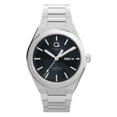 Channeling the bold designs and decadent glamour that filled the scene in ‘70s West Hollywood, the Q Timex Continental brings refinement to our beloved Q Timex collection. This Analogue watch features a calendar function: Day-Date and is equipped with Luminous Hands High quality Silver Stainless steel strap, measuring 21 cm in length and 20 mm in width, with a Fold over with push button clasp Case diameter: 39 mm,case thickness: 9 mm, case colour: Silver and dial colour: Black Water resistant: 5 bars-Weight: 109 g The watch is delivered in an original gift box and has a warranty of 2 years