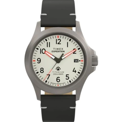 The Expedition Titanium is ready to go the distance, living up to the Timex legacy of fully equipping you for your adventures ahead while embodying the kind of tradition you can wear every day. This Analogue watch has a Calendar function: Date as well as Luminous Hands and Screw Down Crown High quality 21 cm length and 19 mm width a Black Leather strap with a Buckle Case diameter: 38 mm,case thickness: 12.5 mm, case colour: Grey and dial colour: Grey Water resistant: 20 bars-Weight: 48 g The watch is delivered in an original gift box and has a warranty of 2 years