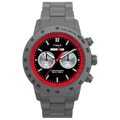 We’re bringing an analog display to our high-performing TIMEX IRONMAN with vibrant red details and a clean dial design. This Chronograph watch has a function: Stop Watch , 24-hour Display , Luminous Hands and Tachymeter High quality 21 cm length and 22 mm width a Gun Stainless steel strap with a Deployment clasp Case diameter: 44 mm,case thickness: 11.5 mm, case colour: Gun and dial colour: Black Water resistant: 10 bars-Weight: 165 g The watch is delivered in an original gift box and has a warranty of 2 years