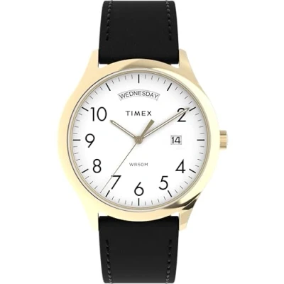 Timex Men's Easy Reader 40 mm Watch Black Leather Strap White Dial Gold Tone Case TW2W68500
