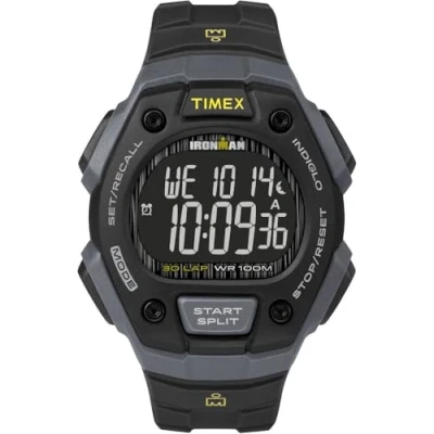 Adjustable black 18 millimeter resin strap fits up to 8-inch wrist circumference 100-hour chronograph with 30-lap memory; 24-hour countdown timer 3 daily, weekday or weekend alarms; 24-hour military time mode; 2 time zones; day, date and month calendar Gray and black 38 millimeter resin case with acrylic lens; black digital display; Indiglo light-up watch dial Water resistant to 100 meters (330 feet): In general, suitable for swimming and snorkeling, but not diving