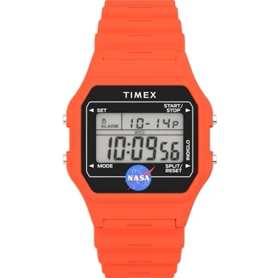 Rectangle orange 36 mm resin case completed with orange resin strap and buckle clasp Digital display featuring time and date Quartz movement Acrylic lens Water resistant to 30m (100ft): in general, withstands splashes or brief immersion in water, but not suitable for swimming or bathing