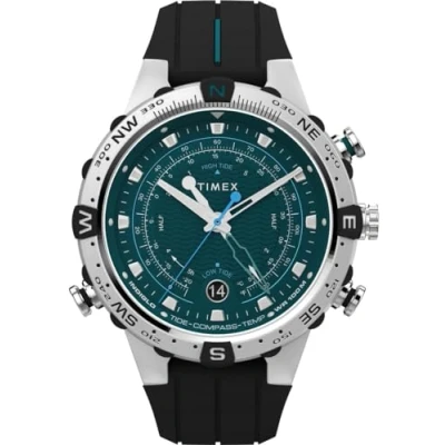 With multiple functions including a tide tracker, temperature sensor, and analog compass display all driven by a dedicated fourth hand, our Tide-Temp-Compass is the ultimate accessory for the tech savvy professional with a love for adventure. This Analogue watch has a Calendar function: Date , Luminous Hands and Luminous Numbers High quality 21 cm length and 20 mm width Black Silicone strap with a Buckle Case diameter: 45 mm, case thickness: 13 mm, case colour: Silver and dial colour: Green Water resistant: 10 bars -Weight: 93 g The watch is delivered in an original gift box and has a warranty of 2 years
