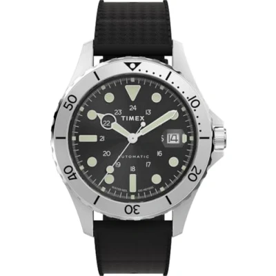 Stainless-steel Case - The durable stainless-steel case is resistant to corrosion, rust, and daily wear and tear. It also features an exhibition case back that allows for a view of the movement ticking within. Automatic Movement - The battery-free 21-jewel Japanese automatic movement is powered by your motion as you wear the watch. Durable Design - The case is fortified with a sturdy crown protector and a durable unidirectional ratcheting stainless-steel top ring that can be used to track elapsed time. Enhanced Visibility - Luminant hands and hour markers make it easier to tell the time in lowlight conditions, while a magnifier in the crystal allows for a better view of the date window at 3 o'clock. Resin Strap - Flexible strap crafted from lightweight resin and perforated for all-day comfort.
