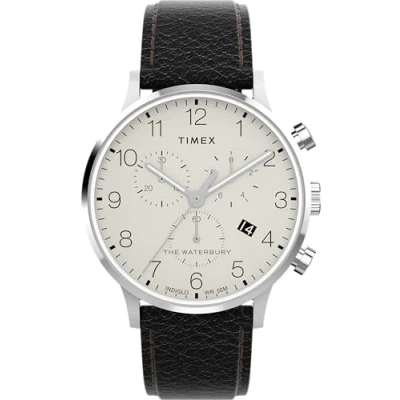Timex Men's Waterbury 40 mm Watch, Black Leather Strap Cream Dial Stainless Steel Case TW2Y29400
