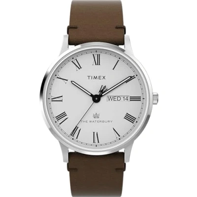 Timex Men's Waterbury 40 mm Watch, Brown Leather Strap White Dial Stainless Steel Case TW2Y29500