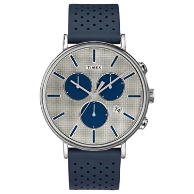 Get all the comfort with this leather band, perfect for every occasion -The watch has a calendar function: date, stopwatch, Indiglo Light High quality 21 cm length and 20 mm width blue leather strap with a buckle Case diameter: 41 mm, case thickness: 11 mm, case colour: silver and dial colour: silver Water resistant: 3 bars -weight: 60 g The watch is delivered in an original gift box and has a warranty of 2 years