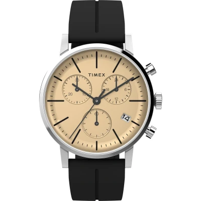 This Timex Midtown Chronograph Watch for Men is the perfect timepiece to wear or to gift. It's Silver 40 mm Round case combined with the comfortable Black Silicone watch band will ensure you enjoy this stunning timepiece without any compromise. Operated by a high quality Quartz movement and water resistant to 5 bars, your watch will keep ticking. This sporty and fashionable watch gives you a unique feeling in every outfit! -The Chronograph watch has a calendar function: Date, Stop Watch and 24-hour Display High quality 21 cm length and 19 mm width Black Silicone strap with a Buckle Case diameter: 40 mm,case thickness: 11 mm, case colour: Silver and dial colour: Champagne