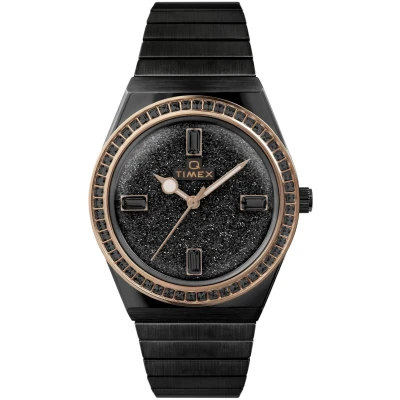 This Timex Q Reissue Analogue Watch for Women is the perfect timepiece to wear or to gift. It's Black 36 mm Round case combined with the comfortable Black Stainless steel watch band will ensure you enjoy this stunning timepiece without any compromise. Operated by a high quality Quartz movement and water resistant to 5 bars, your watch will keep ticking. This dazzling timepiece elevates any outfit to the next level with a shimmering diamond-dust dial, princess-cut crystal bezel, and baguette crystal markers. This Analogue watch has a function: Luminous Hands High quality 19 cm length and 20 mm width Black Stainless steell strap with a Expanding bracelet Case diameter: 36 mm,case thickness: 12 mm, case colour: Black and dial colour: Black