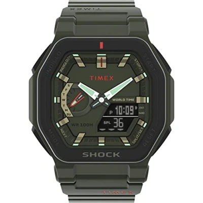 This sporty and fashionable watch gives you a unique feeling in every outfit! -The Analogue-Digital watch has a calendar function: Day-Date, Stop Watch, Countdown and Alarm High quality 21 cm length and 25 mm width Green Plastic strap with a Buckle Case measurement: 45 X 45 mm,case thickness: 14 mm, case colour: Green and dial colour: Green Water resistant: 10 bars -Weight: 58 g The watch is delivered in an original gift box and has a warranty of 2 years