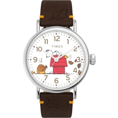 There’s so much to be thankful for! Snoopy eyes this year’s turkey on the white dial of our Timex Standard. This Analogue watch is equipped with Luminous Hands High quality Brown Leather strap, measuring 20 cm in length and 19 mm in width, with a Buckle Case diameter: 40 mm,case thickness: 9.5 mm, case colour: Silver and dial colour: White Water resistant: 5 bars-Weight: 51 g The watch is delivered in an original gift box and has a warranty of 2 years