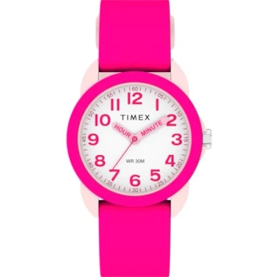 Thoughtfully designed and built durable enough for kids on the move, our Timex Kids Analog watch makes timekeeping fun. High quality 19 cm length and 16 mm width a Pink Silicone strap with a Buckle Case diameter: 30 mm,case thickness: 10 mm, case colour: White and dial colour: White Water resistant: 3 bars-Weight: 04 g The watch is delivered in an original gift box and has a warranty of 2 years