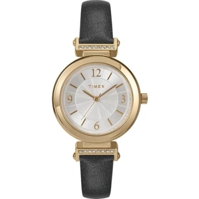 Timex Women's Main Street 31 mm Watch, Black Leather Strap Silver Tone Dial Gold Case TW2W96400