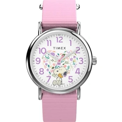 Timex x Peanuts - Celebrate the sweetness of spring year-round with our Peanuts Floral watch, featuring the 38mm silver-tone case construction of our beloved Timex Weekender INDIGLO Backlight - Tell time in the dark by simply pushing the watch's crown Fabric Strap - The comfortable fabric strap features a slip-thru design for easy on and off Quartz movement, indiglo light-up dial, strap fits wrist circumferences 135-190 mm Water resistant to 30m (100ft): in general, withstands splashes or brief immersion in water, but not suitable for swimming or bathing