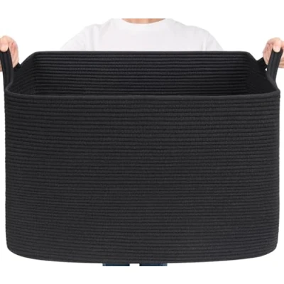 TIMEYARD 105L Large Woven Storage Basket, Extra Blanket Basket for Living Room, Bedroom, Rectangle Cotton Rope Organizer Toy Storage,63.5x40.5x40.5cm, Black