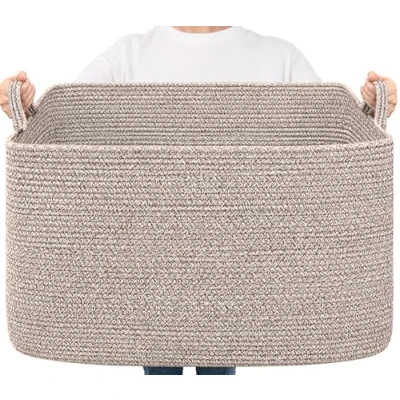 Spacious and Versatile: Measuring 60x40x35 cm with a 85L capacity, this large storage basket is perfect for storing blankets, pillows, clothes, towels, toys, and more in the living room, helping you maintain a tidy living space Soft Material: Crafted from soft cotton rope, this woven basket retains its shape while being gentle on clothes and skin, making it ideal for households with babies or pets Convenient Handles: The rectangle basket is designed with sturdy handles for easy lifting and carrying, even when fully loaded with blankets or clothes, providing a hassle-free user experience Versatile Storage Solutions: This cotton rope basket is versatile and can be used anywhere in the home. It is a perfect storage basket for the living room, laundry room and bedroom. It not only provides convenient storage space but also adds beauty and tidiness to the home Note: The towel basket is folded for transport, it will quickly turn back to its elegant shape when you fill it with some towels or clothes, an iron is also a good idea