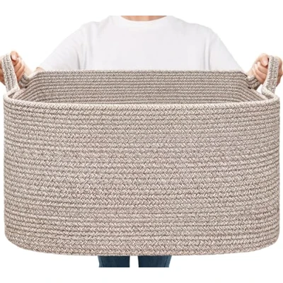 Extra Large Blanket Basket: measures 55x38x30 cm with a 65L capacity, providing ample space for 4-5 throw blankets, 3 big pillows, or 2 quilts. Keep your home organized Rectangle Storage Basket Design: Say goodbye to round baskets that only occupy the floor. Our rectangular laundry basket can be placed on the floor or fitted onto a shelf, wardrobe, or closet. Perfect for organizing dirty clothes and keeping them out of sight Convenient and Easy to Move: Our large toy basket comes with two handles, making it easy to move from room to room. With a height of 12 inches, it is also easily accessible for kids who want to reach in and grab their toys. And when not in use, it can be easily folded and stored to save space Multifunctional Storage Basket: With a neutral color scheme, our woven decorative storage baskets blend seamlessly with any room decor. Use them to store extra throw blankets in the living room, kids' stuffed toys in their room, towels in the bathroom, and clothes in the laundry room Durable and Soft Material: Our cotton rope basket is made of thick, durable fabric that is good for babies, kids, and pets to touch. It is also no chemical smells, making it perfect for storing a wide range of items