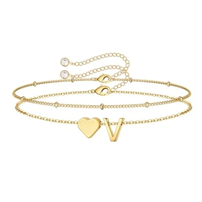 TINGN Birthday Gifts for Women Girls, 14K Gold Plated Layered Heart Initial V Bracelets Womens Bracelet Girl Kids Mothers Day Gift Girls Jewelry
