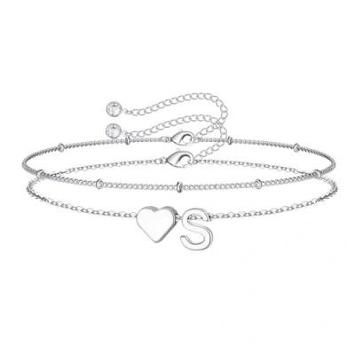 TINGN Gifts for Teenage Girls, 14K White Gold Plated Layered Silver Heart Initial S Bracelets Womens Bracelet Girl Kids Bridesmaid Gift Girls Jewelry