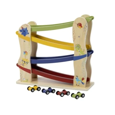WOODEN CAR RAMP: with 4 wooden cars that slide their way down the ramp, teaching your child about gravity and motion - Suitable from 18+ months; Product dimensions (cm): 31 x 29 x 10 (H x W x D) HOURS OF PLAYTIME: the ramp will spark your child's fascination resulting in endless hours of fun, enjoying every rewarding, click-clacking movement as the wooden race cars slide down the ramp FOSTERS MOTOR SKILLS: as your little one places the wooden toy cars one by one on the car ramp and make them whizz down, your toddler can practice and improve fine motor skills 4 EASY-ROLL WOODEN RACE CARS: the race cars glide smoothly down the wooden ramp, demonstrating the force of gravity and aspects of motion to your toddler NATURAL DESIGN: the tree-shaped race car ramp features an earthy natural wood design and soothing color scheme, as well as illustrations of cute animal characters