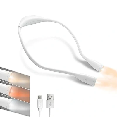 Hands-Free Neck Book Light: This neck light is made of a specific material and designed to fit the shape of your neck, providing comfort during reading. The humanized design allows for a burden-free and hands-free reading experience, saving space. 3 Light Modes and Stepless Dimming: Equipped with 4 LED beads, including 2pcs Cool White LEDs (10000K) and 1pcs warm white LED (1600K), this light offers eye-caring soft illumination. Each flexible arm has 2 LEDs. Adjust the light brightness by long-pressing the button and change the light color with a press. USB Rechargeable Book Light: The neck light features a built-in 1000mAh lithium battery, which can be fully charged in 5 hours and provides over 72 hours of working time. It comes with a DC 5V USB cable, allowing you to use and charge it anytime and anywhere (AC adapter not included). 360° Flexible and Lightweight: With a net weight of 102g, this neck light is lightweight and made of soft silicone material. The flexible arms can be adjusted 360°, enabling you to find the perfect lighting angle that suits your needs. Support and Application: This neck light has passed FCC, CE, and ROHS certifications, ensuring its quality and safety. It is perfectly suitable for indoor and outdoor activities such as reading beside a table or bed, fishing, running, camping, repairing, climbing, knitting, sewing, and more.