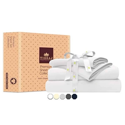 Tissaj 100% Organic Cotton Sheet Set GOTS Certified 1 Fitted Sheet, Flat and Pillowcases (Single, Ultra White)