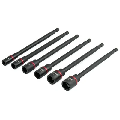 Impact grade 6-Inch long SAE sized nut driver set Red Color ring for easy size identification Sizes 1/4", 5/16", 3/8", 7/16", 1/2" and 9/16" 1/4-Inch hex shank fits any standard drill chuck Includes handy storage rail, Weight: 1.1 pounds, Manufacturer: TitanTools