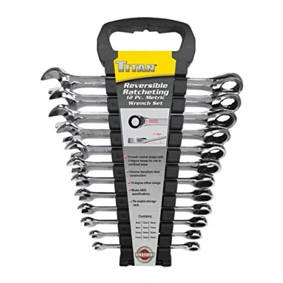 Set includes: 8, 9, 10, 11, 12, 13, 14, 15, 16, 17, 18, and 19mm and a reusable storage rack 12-Point 72-Tooth box-end ratchet design allows for fast action combined with the versatility of an open-end wrench Constructed of chrome vanadium steel with mirror polish finish | low profile directional switch is unobtrusive and allows for easy change of direction without removing from fastener 72-Tooth ratcheting mechanism produces a minimal sweep of 5 degrees - perfect for tight, confined, and hard-to-reach areas Made in Taiwan, Weight: 3.55 pounds, Manufacturer: Titan