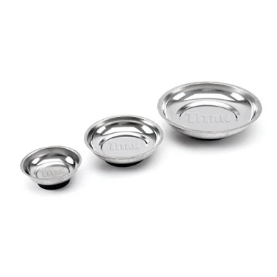 Set of 3 stainless steel magnetic parts trays Includes 3", 4-1/4" and 5-7/8" diameter trays Perfect for holding parts, hardware and fasteners in place Sticks to any ferrous metal surfaces Non marring rubber covered magnetic base.fit type: Universal Fit