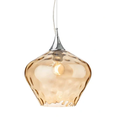 The Titan Pendant Light boasts a classic design accentuated by its wavy amber glass shade. This unique glass effect not only adds visual interest but also creates a warm and inviting atmosphere. The chrome finish complements the amber glass, adding a touch of sophistication and contemporary flair to your decor. Its beautiful appearance ensures that it will be a focal point whether it's illuminating your dining table, enhancing your kitchen island, or bringing style to your living room.