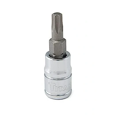 1/4" drive chrome vanadium socket with corrosion-resistant chrome plated finish T25 star bit constructed of strong S2 steel Drive end detent notches provide secure retention of ratchets and extensions Easy to read die-stamped size marking Made in Taiwan, Manufacturer: Titan Tools