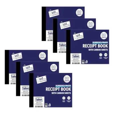 PACK CONTENTS: Set of 6 professional receipt books, each containing 80 numbered pages with integrated carbon sheets for automatic duplicate copies COMPACT SIZE: Each receipt book measures 12.6 cm x 10.1 cm (A6 half size), perfect for portable business transactions and record keeping PROFESSIONAL DESIGN: Ruled paper format with dedicated fields for date, amount received, and transaction details ensures organised record keeping PRACTICAL FEATURES: Numbered pages from 1-80 for easy reference and tracking, with carbon sheets providing instant duplicate copies QUALITY CONSTRUCTION: Sturdy cover design and secure binding keeps receipts intact and protected for long-term record keeping