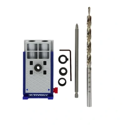 DRILLING AND ASSEMBLY KIT: Consisting of an oblique drilling guide, a step drill and everything you need to assemble wooden panels, this kit is designed to make invisible T or angle assemblies. A VERSATILE GUIDE: Designed to facilitate the assembly of panels with thicknesses ranging from 0,51" to 1,57", the guide allows perpendicular or 15° angled holes to be drilled with 15/64", 5/16", 25/64" diameter drills. PRECISION ADJUSTMENT TO YOUR NEEDS: The guide is equipped with a graduation system to adapt drilling to the thickness of the boards to be assembled, perfect for preventing the risk of cutting through the panel being drilled. COMPLETE SET: This kit, designed and patented by Tivoly, also includes a PZ2 screwdriver bit, a depth stop and an Allen wrench, providing a complete solution for invisible assemblies. THE ASSURANCE OF SUCCESS: Tivoly Developed By Peugeot is a French brand that has been designing cutting tools, portable electrical accessories and tools for professionals and consumers since 1917.
