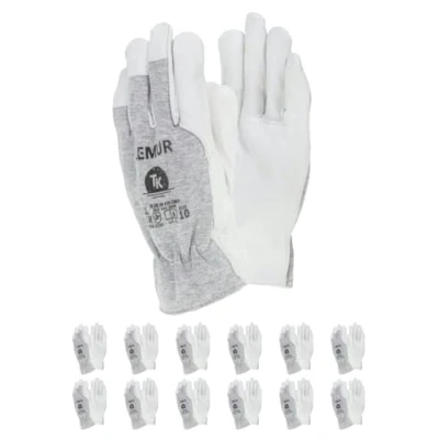 TK Lemur Leather Work Gloves, Assembly Gloves, Size 11, 12 Pairs, Made of Grained Goatskin Leather Assembly Gloves Reinforced with grained goatskin High-quality cotton Leather-covered thumb Knitted cuffs with elastic band