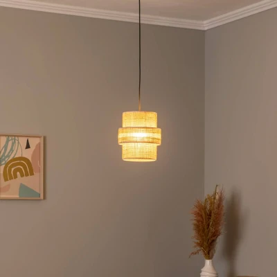 Calisto pendant light with cylindrical shade made of natural brown Jute The Calisto pendant light has a cylindrical lampshade made up of two spheres of different diameters. Their jute textile gives the hanging light a cosy and natural character.
