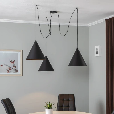 CONO pendant light with three black lampshades and decentralised suspension The lampshades of the CONO pendant light are made of steel in a timeless cone shape and finished in matt black. The light is emitted downwards, making the pendant light ideal for table or area lighting. Thanks to decentralised fixing points, the lampshades can be positioned as desired.