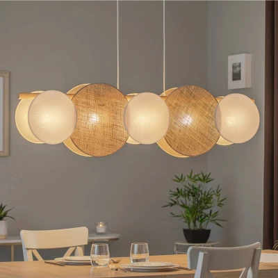 Pulse pendant light with jute shades, five sockets and wooden beams The Pulse pendant light is fitted with flat, round jute textile lampshades in white and natural brown colours and different sizes. There are a total of five E27 sockets between them. There is also a wooden beam and a white metal canopy.