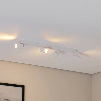 Adjustable ceiling spotlight Top with four cylindrical heads The GU10 ceiling spotlight Top in steel with a white finish consists of a long canopy and four cylindrical spotlight heads arranged in a row. The latter are adjustable so that the light can be directed to the desired area.