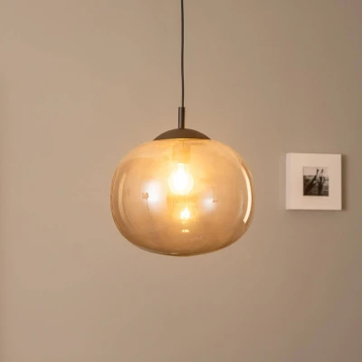 Vibe glass pendant light with round lampshade in graphite grey The Vibe pendant light is particularly impressive in modern furnishing concepts. It combines black elements with an almost spherical glass shade. The graphite grey transparent material allows a view inside, so that a decorative E27 bulb is perfectly accentuated.
