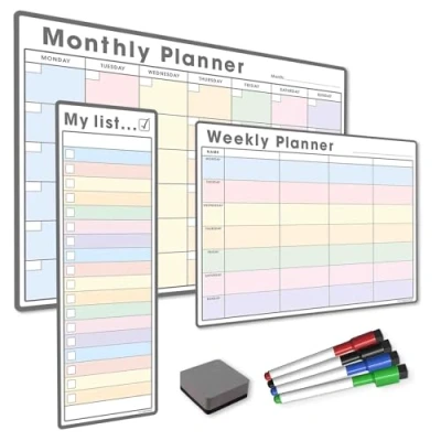 TMS #1 Magnetic Whiteboard Planner Pack/Custom Dry Erase Set Weekly Planner, My List, Monthly Calendar 4 Wipe Marker Pens, Eraser (Pastel, Bundle 1)