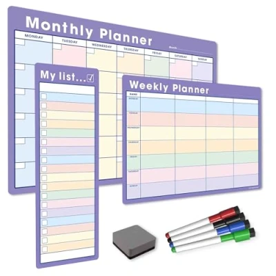 TMS #1 Magnetic Whiteboard Planner Pack/Custom Dry Erase Set Weekly Planner, My List, Monthly Calendar 4 Wipe Marker Pens, Eraser (Pastel/Purple, Bundle 1)