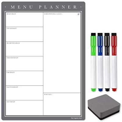 The Magnet Shop Magnetic A3 Weekly Meal Planner – Customisable Whiteboard Planner, Menu, Shopping List and Wall Organiser - with 4 Dry Erase Pens and Eraser (Charcoal Grey, A3)