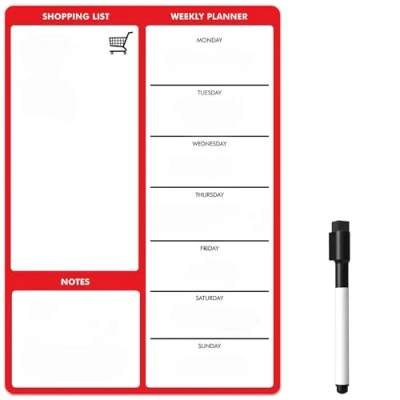 TMS Magnetic Weekly Planner and Dry Wipe Pen, Meal Shopping List, Fridge Whiteboard for Prep, Notes Reminders, Daily Plan Erase Memo Board, Kitchen or Office (Red, A4)