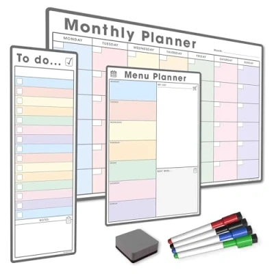 TMS Magnetic Weekly Planner Bundle | A4 Menu Planner, A3 Monthly Calendar, to Do List, Dry Wipe Markers and Eraser (5 Pack) | Magnetic Whiteboard Set