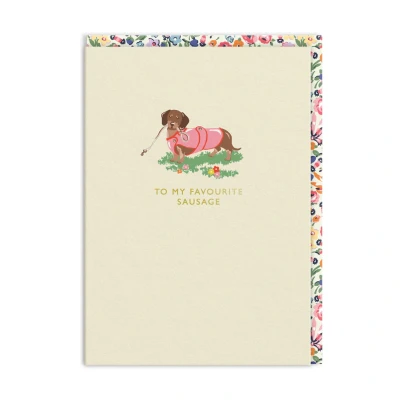 This fun card with its dachshund inspired artwork is sure to bring a smile to its recipient. Brought to you by Ohh Deer from their 'Cath Kidston' range. Message outside reads: To my favourite Sausage. Blank inside for your own message. Card measures: 150mm x 105mm. Printed in the UK and supplied with a quality envelope.