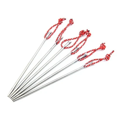 Material:Titanium Alloy Dimensions:5/32" (4mm) (Dia) x 6 1/8" (155mm) (Length) Flat head and sharp tip make it easy to drive into hard surfaces. Each peg comes with a nylon cord tied through the eyelet. Each 6 pegs comes with a pouch.