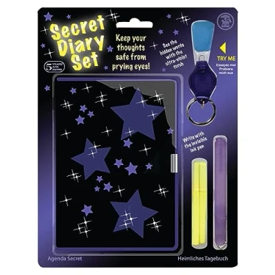 Secret writing set that allows you to write and record secret messages in a lockable diary The invisible ink pen only shows up under ultra-violet light, such as that from the UV torch included Set includes diary, padlock, key, invisible pen (with 2 x refills) and a UV torch Diary is approx. 14.5cm, batteries included, packaging dimensions are W18.5cm x H23.5cm x D2cm All TOBAR products are rigorously tested and certified safe to the highest EU and UK standards, Manufacturer: Tobar