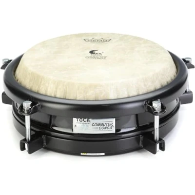Commuter Congas are portable drums that are perfect for musicians on the go. They are available with 10", 11" and 12" heads and come standard with Remo Fiberskyn heads. The drums are available separately with or without stands, or you can choose a set of two with a double stand. The tension lugs are accessible from above, making it quick and easy to adjust the sound and tuning. The 10-inch drum has a 3-inch diameter port at the bottom, which makes the trebles sound loud and clear and brings out the slaps. The sturdy steel stand has an adjustable arm to securely hold both sizes of the Commuter Conga.